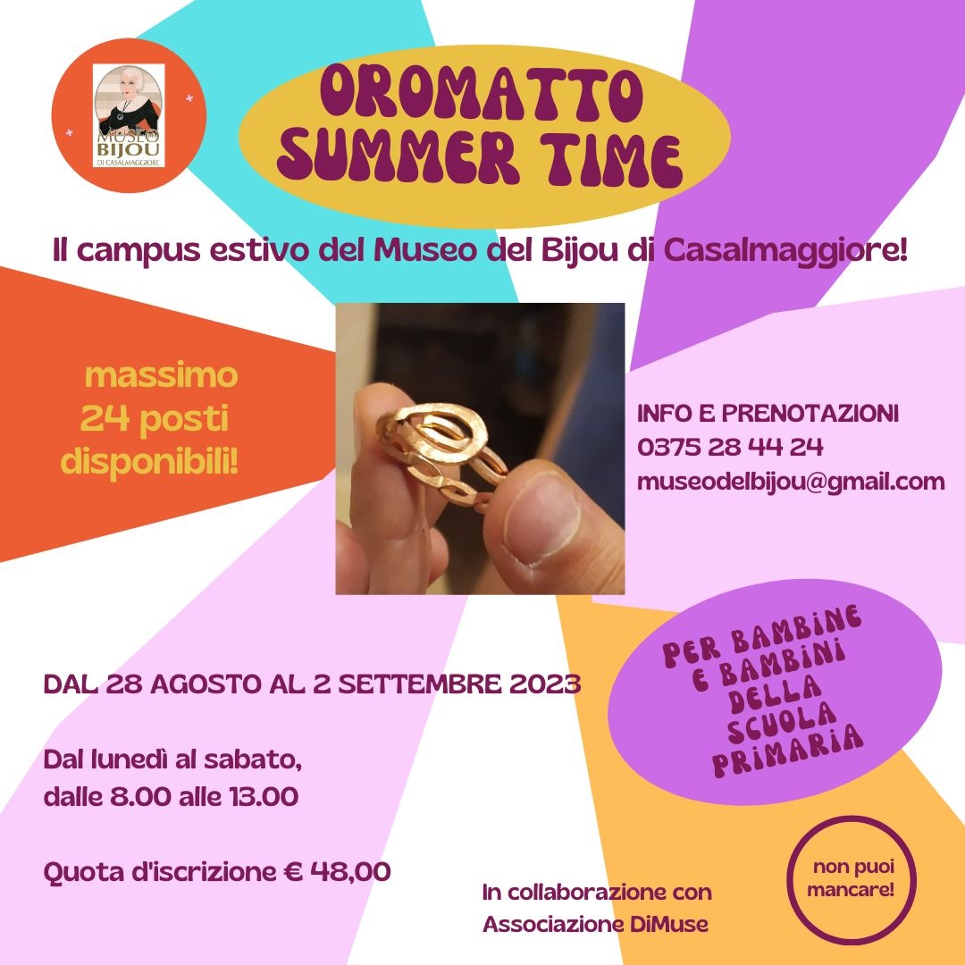 Torna anche quest'anno il campus estivo del Museo del Bijou per bambine e bambini della scuola primaria: una settimana, dal lunedì al sabato, dalle 8 alle 13, per scoprire il museo divertendosi e per stringere amicizie creative. "Oro Matto Summer Time" 2023 si tiene dal 28 agosto al 2 settembre, in collaborazione con l'Associazione DiMusE.