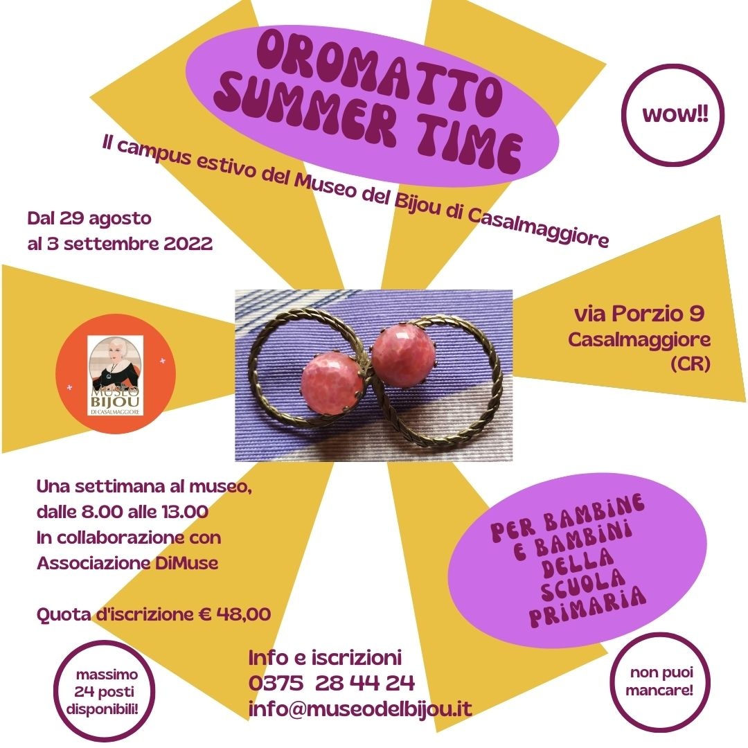 Dal 29 agosto al 3 settembre 2022, il Museo del Bijou organizza il campus "Oromatto Summer Time": attività creative, laboratori, letture, e bijoux da progettare e creare nel fresco dei corridori settecenteschi e del cortile.