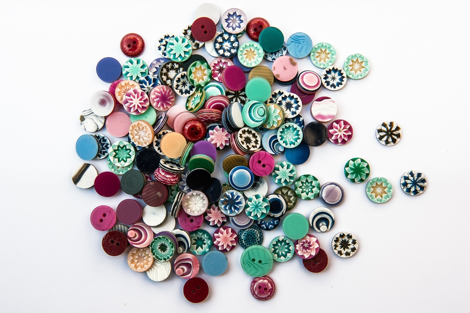 Direttamente dall’archivio parigino di Lea Stein sono così pervenuti a Casalmaggiore centinaia di pezzi mai esposti prima: le spille più rare, fra cui le strabilianti serigrafate, gli oggetti di tabletterie (alcuni dei quali creati come prototipi per Guerlain), bracciali, anelli, collane e bottoni… Fiumi di bottoni!