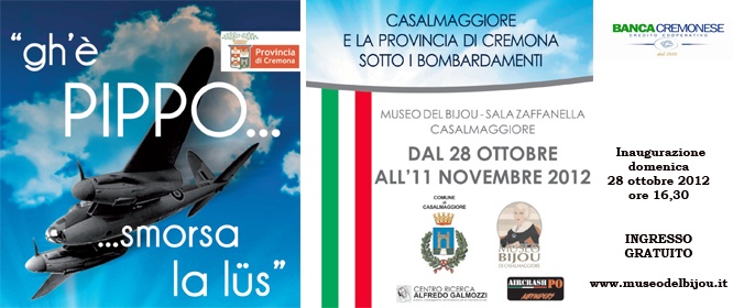 Le nostre sale un tempo furono rifugio antiaereo per la popolazione. Siamo partiti da qui per accogliere la proposta del gruppo Air Crash Po presieduto da Stefano Merli per ospitare al Museo del Bijou la mostra “Gh’è Pippo..smorsa la lus”, che raccoglie ed espone testimonianze, immagini aeree, cimeli legati agli anni 1944-45, quando l’aereo degli Alleati solcava i cieli della Pianura Padana per seminare paura, bengala e bombe. Mentre le Fabbriche Riunite di Casalmaggiore continuavano strenue la produzione, intorno la piazza, e i negozi, e le famiglie risentivano pesantemente di quel tremendo scorcio di guerra. E al suono dell’allarme che annunciava l’arrivo di Pippo, la gente del quartiere si rifugiava dove ora la storia si racconta coi bijoux…