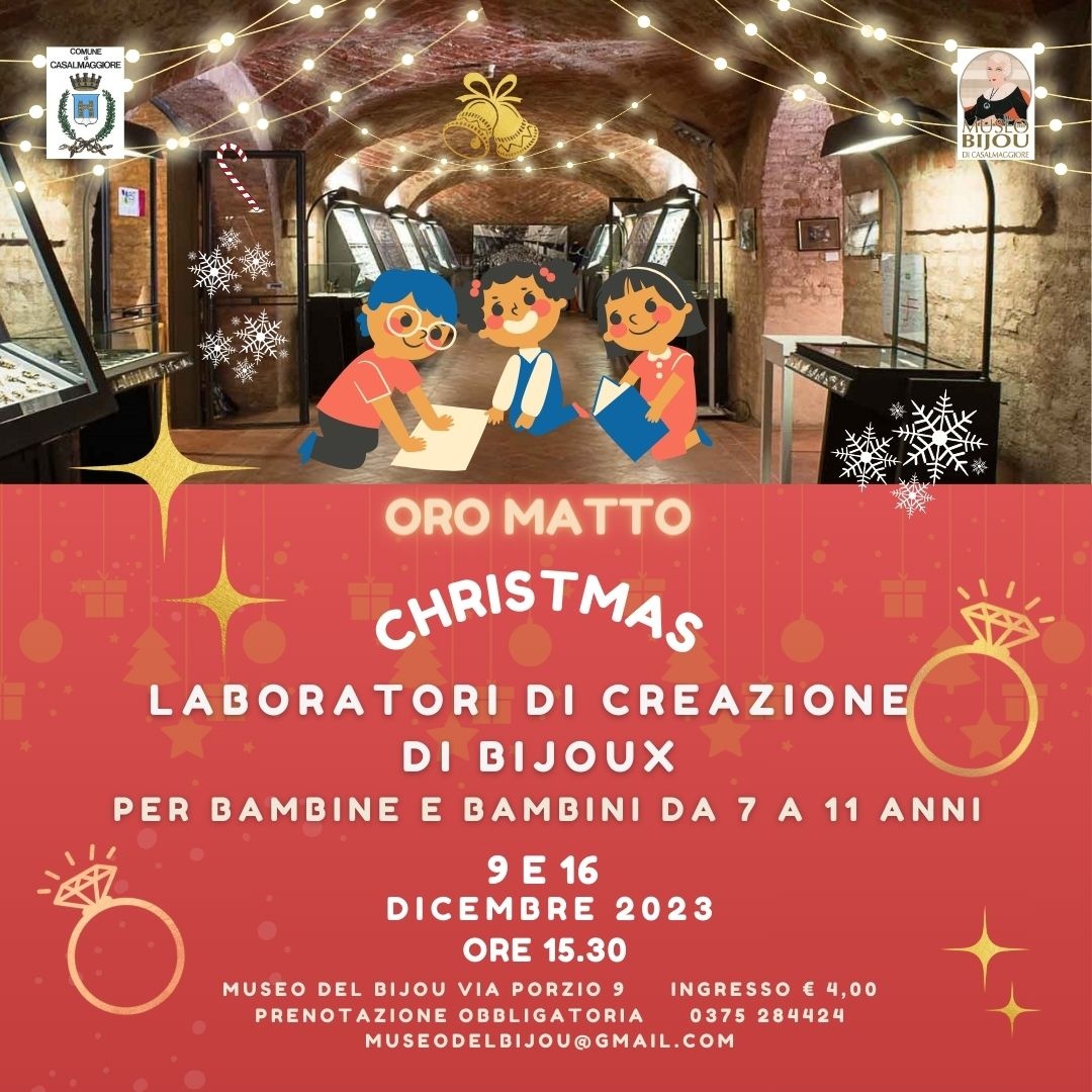Torna anche nel 2023 la proposta di laboratori di creazione di bijoux per bambine e bambini: Oro Matto Christmas! Due appuntamenti per stare insieme, valorizzare fantasia e manualità, conoscere materiali e tecniche semplici di assemblaggio. La prenotazione è obbligatoria al numero 0375 284424 o alla mail museodelbijou@gmail.com. Dai 7a gli 11 anni.
