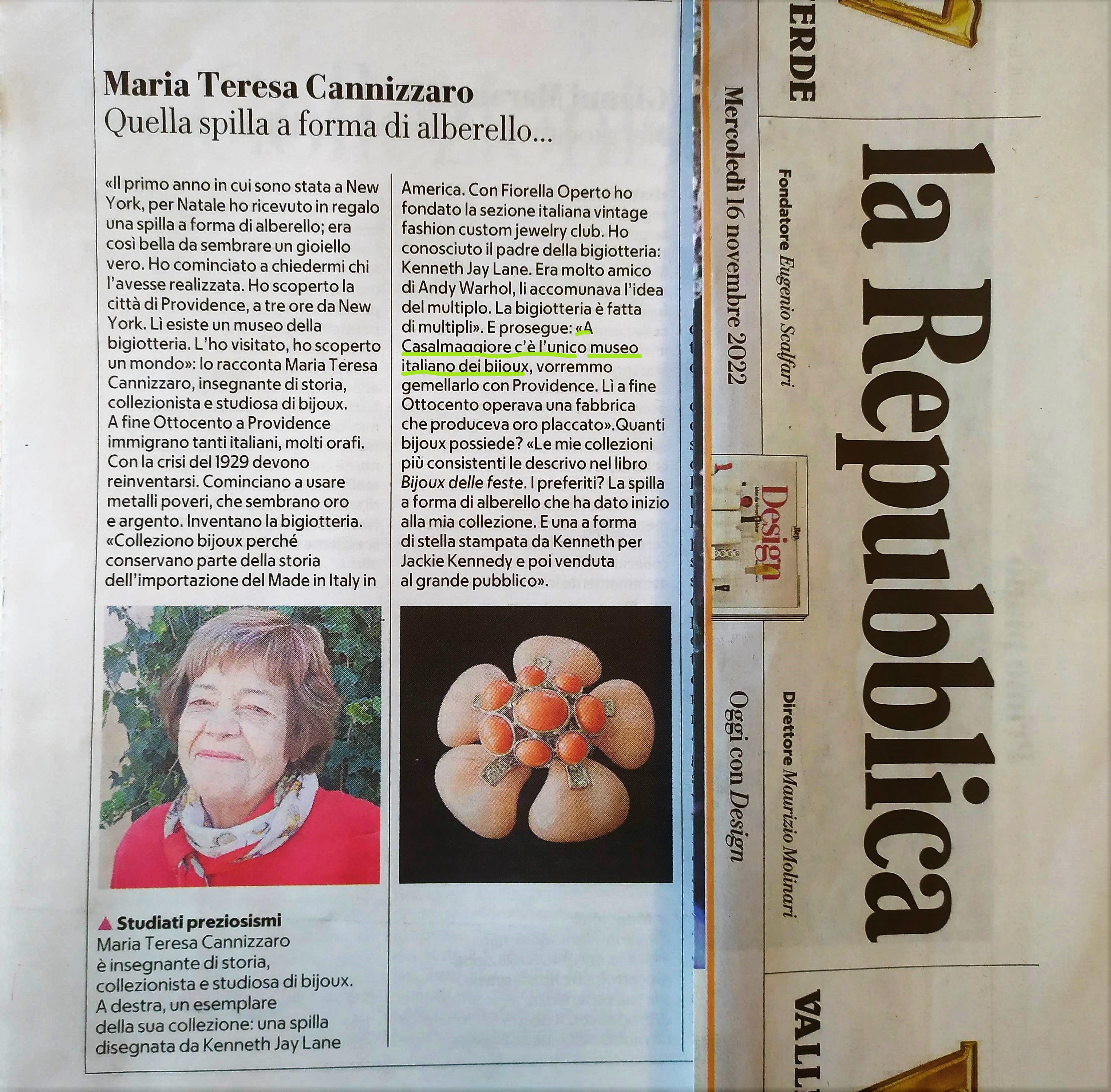 Nell'inserto odierno del quotidiano la Repubblica (Design), Maria Teresa Cannizzaro racconta la sua passione per i bijoux americani e cita il Museo del Bijou come unico presidio culturale in Italia dedicato alla bigiotteria, sognando un gemellaggio con Providence. Grazie, professoressa cannizzaro! All'interno delle stesse pagine, compaiono le testimonianze di altri due nostri collaboratori: Ilaria Dazzi, con cui abbiamo realizzato una stupenda mostra collaterale durante il MercanteinFiera di qualche anno fa, e Augusto Panini, che insieme a Bianca Cappello ha curato la penultima nostro esposizione dedicata ai gioielli di vetro.