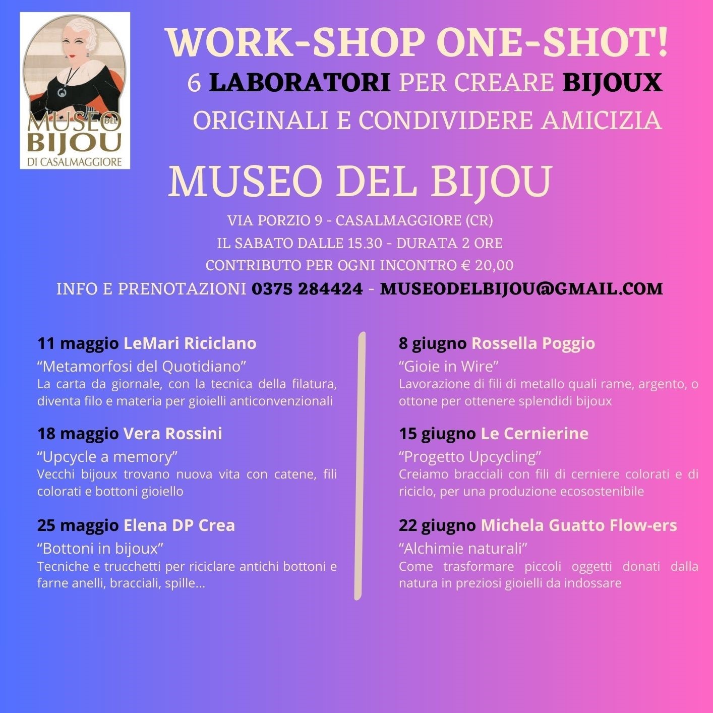 Ritornano le proposte di laboratorio per adulti negli spazi del Museo del Bijou: il calendario prevede sei incontri con altrettante artiste, per apprendere tecniche di creazione di bijoux con i materiali più diversi, spesso accomunati dal concetto del riciclo e del recupero. Tutti gli incontri si terranno di sabato, a partire dalle 15.30 e per una durata di circa due ore. Info e prenotazioni contattando lo 0375 284424 o scrivendo a museodelbijou@gmail.com. Contributo richiesto per ogni incontro € 20,00.