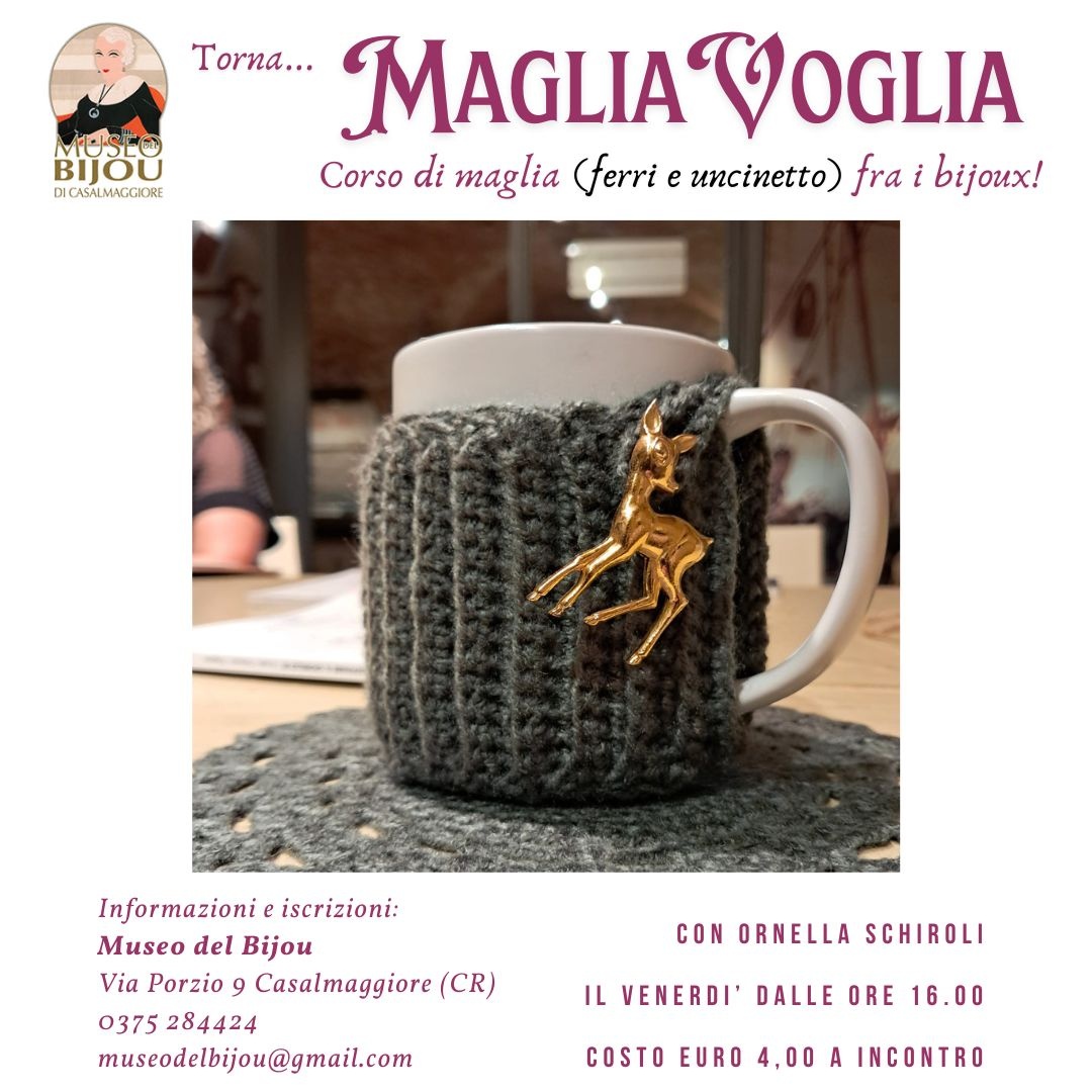 Dal 26 settembre, riprende il corso che fa stare bene e fa nascere amicizie: Ornella Schiroli riprende la docenza del corso di ferri e uncinetto per chi vuole approcciarsi a queste tecniche rilassanti e creative. L'appuntamento è per le ore 16 del venerdì; il costo è di € 4,00 ad incontro. Info e iscrizioni (fino ad esaurimento posti) a questi contatti: 0375 284424 - museodelbijou@gmail.com.