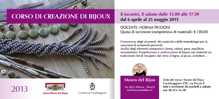 Per chi vuole imparare, per chi ama sperimentarsi, per chi sogna di creare usando estro e fantasia, apprendendo tecniche e provando materiali. Progettare bijoux per sè, per gli amici, per passione: l’associazione Amici del Museo del Bijou organizza anche quest’anno il Corso di Creazione di Bijoux, in collaborazione con l’Amministrazione Comunale di Casalmaggiore, sotto la docenza di Norma Piccioni.Il 6 aprile si è tenuta la “lezione zero” del corso: per chi volesse iscriversi, ci sono ancora posti disponibili.