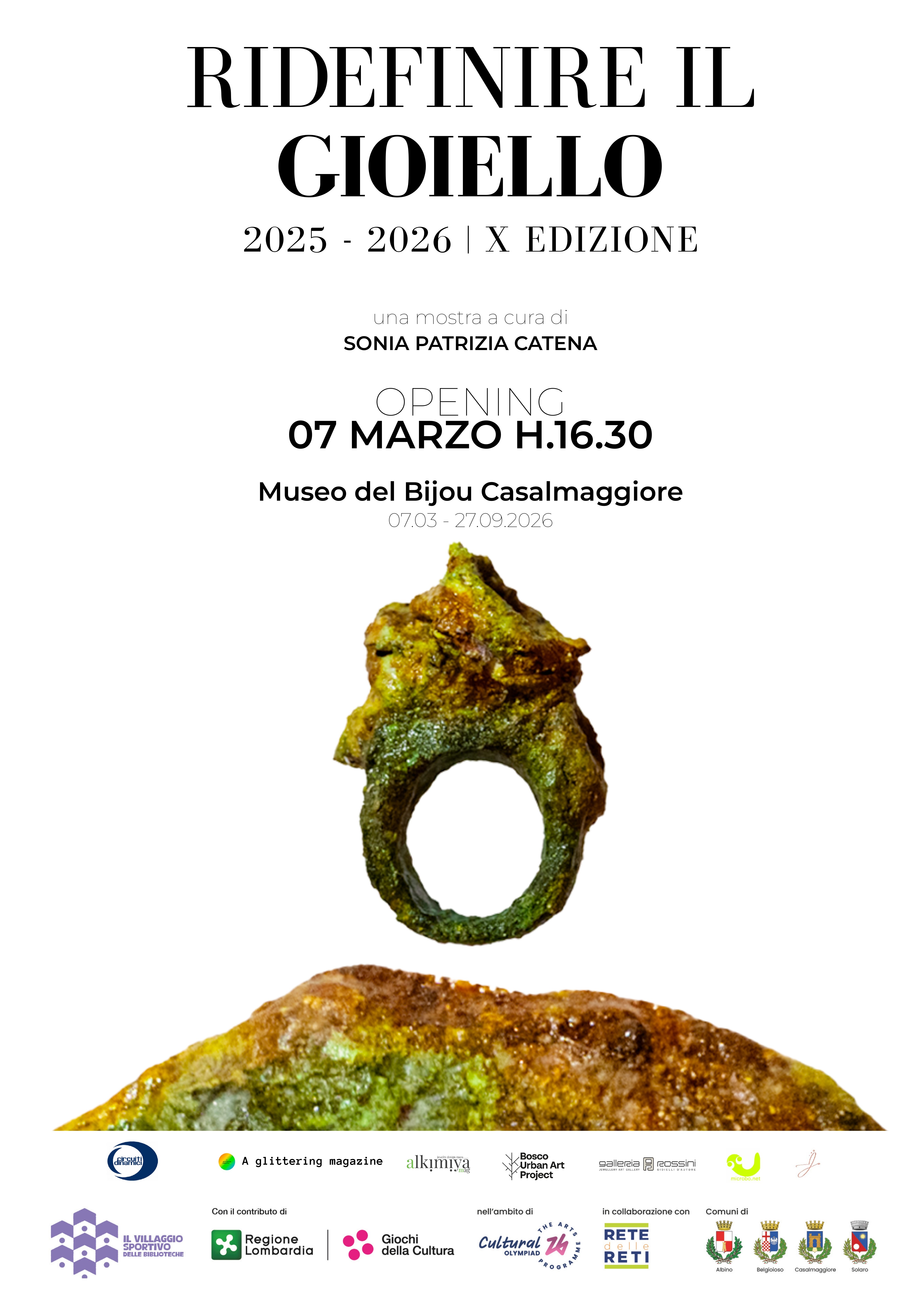 Il Museo del Bijou di Casalmaggiore ospita la decima edizione di Ridefinire il Gioiello, progetto curatoriale ideato e diretto da Sonia Patrizia Catena dal 2010, dedicato alla ricerca e alla valorizzazione del gioiello contemporaneo come linguaggio artistico autonomo. La mostra è inserita nel progetto “Il villaggio sportivo delle biblioteche”, finanziato da Regione Lombardia nell’ambito dell’iniziativa Giochi della Cultura in occasione dei Giochi Olimpici e Paralimpici Invernali di Milano Cortina 2026. Ne fanno parte i Comuni di Albino (BG), Belgioioso (PV), Casalmaggiore (CR) e Solaro (MI), in un’azione condivisa di valorizzazione culturale del territorio.